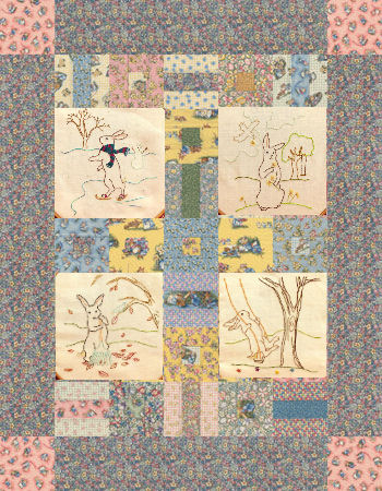 And now my request for help please. I have decided (with some trepidation, but totally encouraged by Julie) to embark upon making a quilt. I am starting small and have decided to incorporate my Four Seasons Bunnies blocks from Nakisha into a cot quilt. I have found a pattern …. here it is with the bunny blocks overlaid….