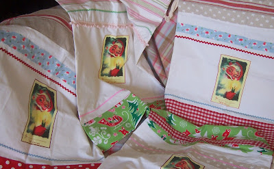 Here’s a closeup of one of the sacks – I made the drawstring channel by cutting a 3″ strip of fabric to fit around the base plus a bit extra to turn under at the side seam. I turned under 1/2″ top and bottom then machine stitched along the edges to attach to the base leaving the side opening unstitched. Threaded through some 1″ cotton tape and hey presto! You can just see the tape peeping out at the top right of the picture. Trimming the sack was the fun part – I tried to make sacks that both boys and girls would love.