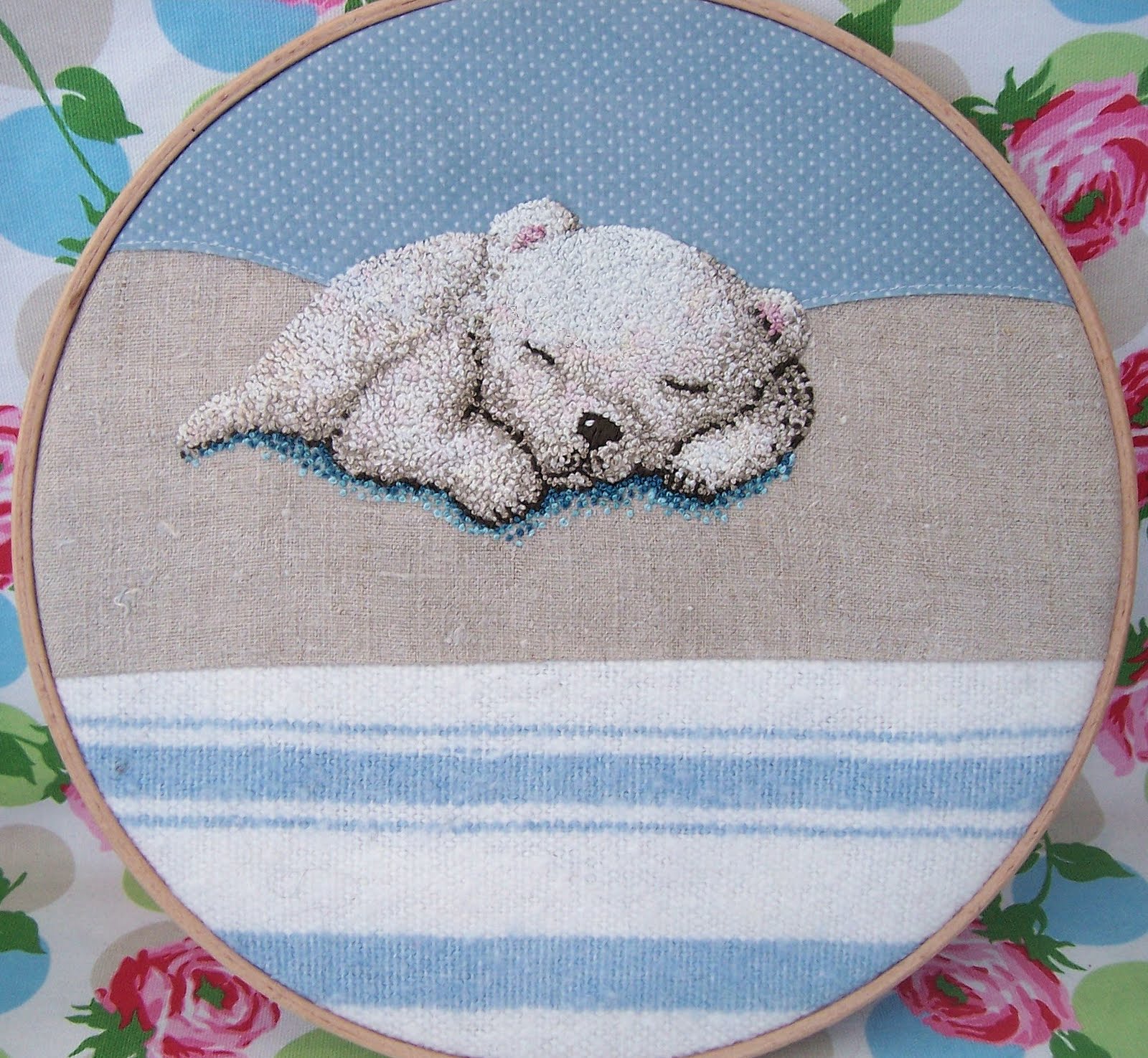 Then it was back to the gazebo to carry on with the little polar bear mentioned at the top of this post. I am taking this competition very seriously. After all, I have not won anything since I scooped Highly Commended for my miniature garden back in (ahem!) 1967! I do not for a moment really expect to win anything now … the standard of work is so high …. do take a look but the thought of getting my paws on EVERY SINGLE COLOUR of dmc floss sustained me as I worked the twenty millionth French knot!!