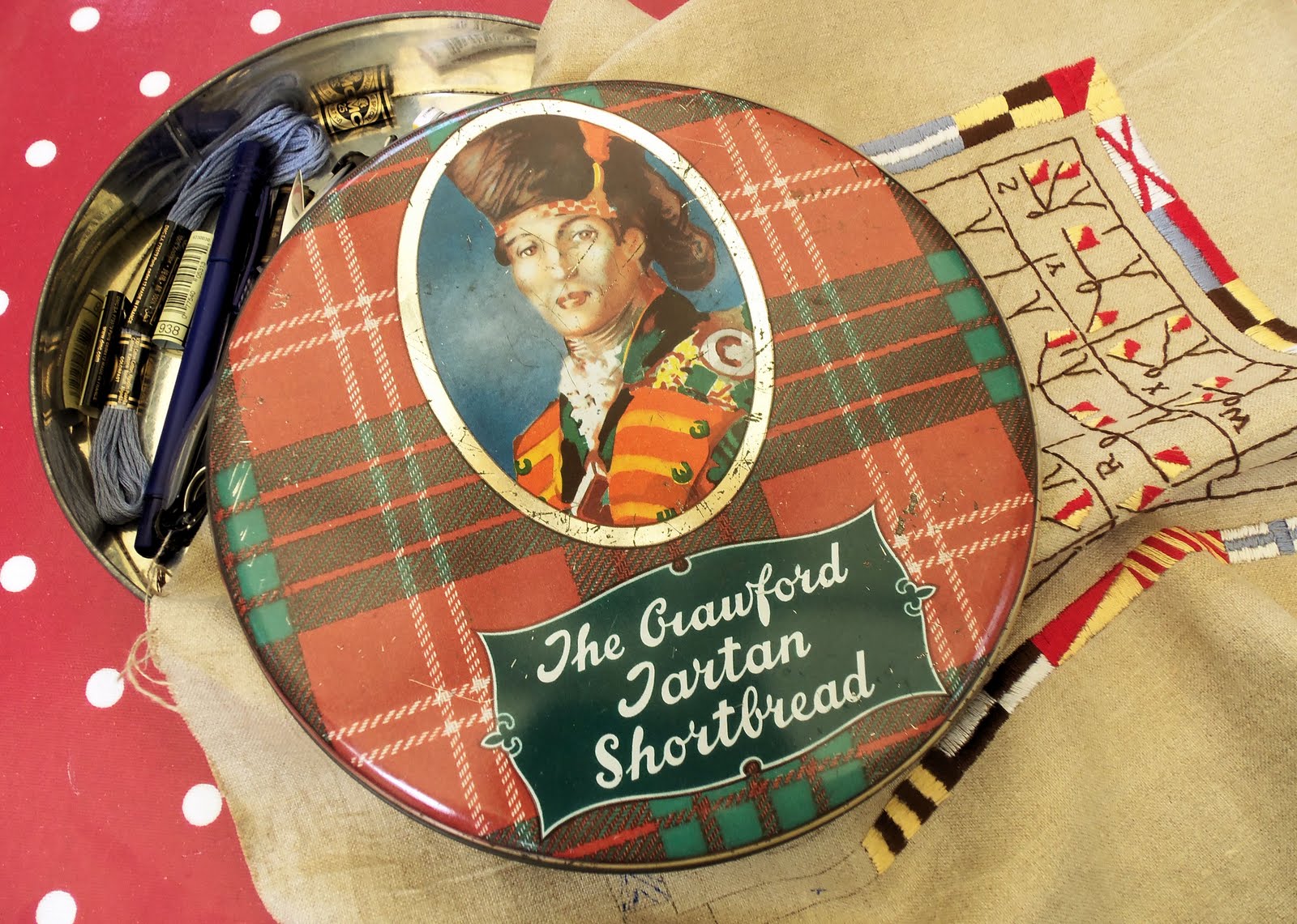 The book with all the vintage ads looks fun! How cool that you found your tin in it. (I LOVE shortbread!) Your embroidery project looks perfect for summer. (Nautical alphabet?)