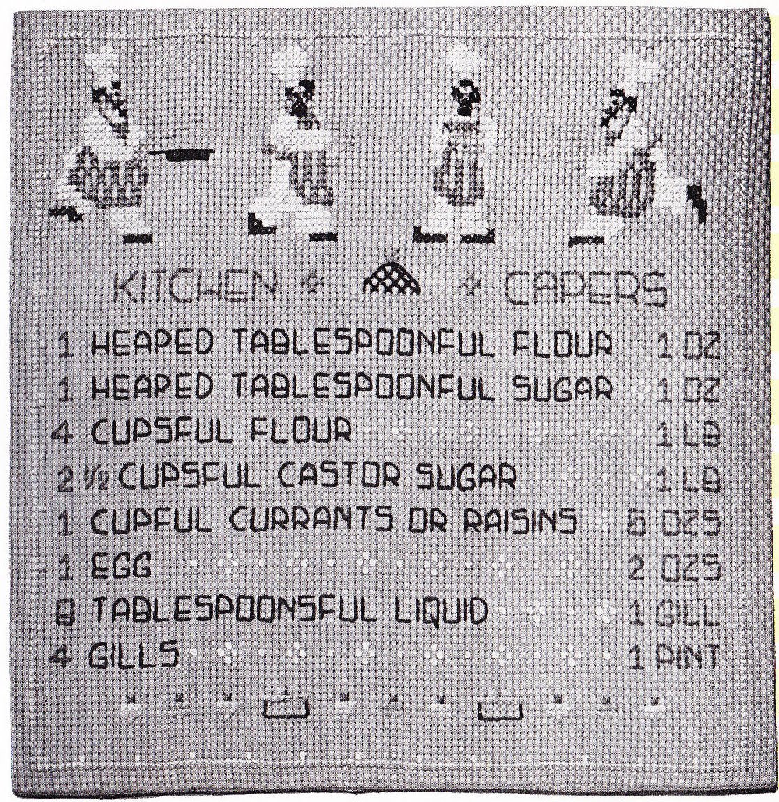 The page is headed “Kitchen Magic” and the pattern is a lovely conversion chart for kitchen weights and measures. I think it’s great … would look lovely on a cream panel to add a touch of retro to any kitchen.