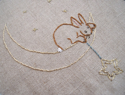 My Moon Rabbit is a very simple design – worked in outline only – a mix of chain and stem stitch with a few French knots for his tail. The moon is stem stitch in cream floss whipped with gold. I hope you like him – please click here to download your free transfer.