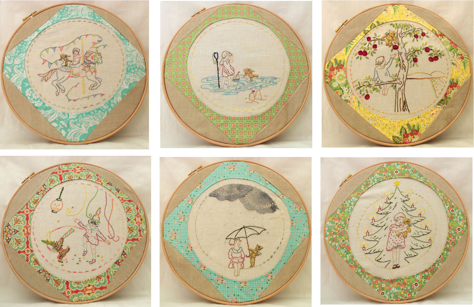 As I haven’t any new work to show you today, I thought I’d give you a quick sneak preview of the work I have been doing on my Rosie & Bear quilt. I have been busy mounting the embroideries in 10″ squares from a Moda Layer Cake (this one’s Flora by Lauren and Jessi Jung) using reverse applique. Then I’ve set them into 13.5″ blocks ready to piece into the full 12-month quilt. More to follow soon … plus photos of the remaining blocks that will (at last) complete the set.