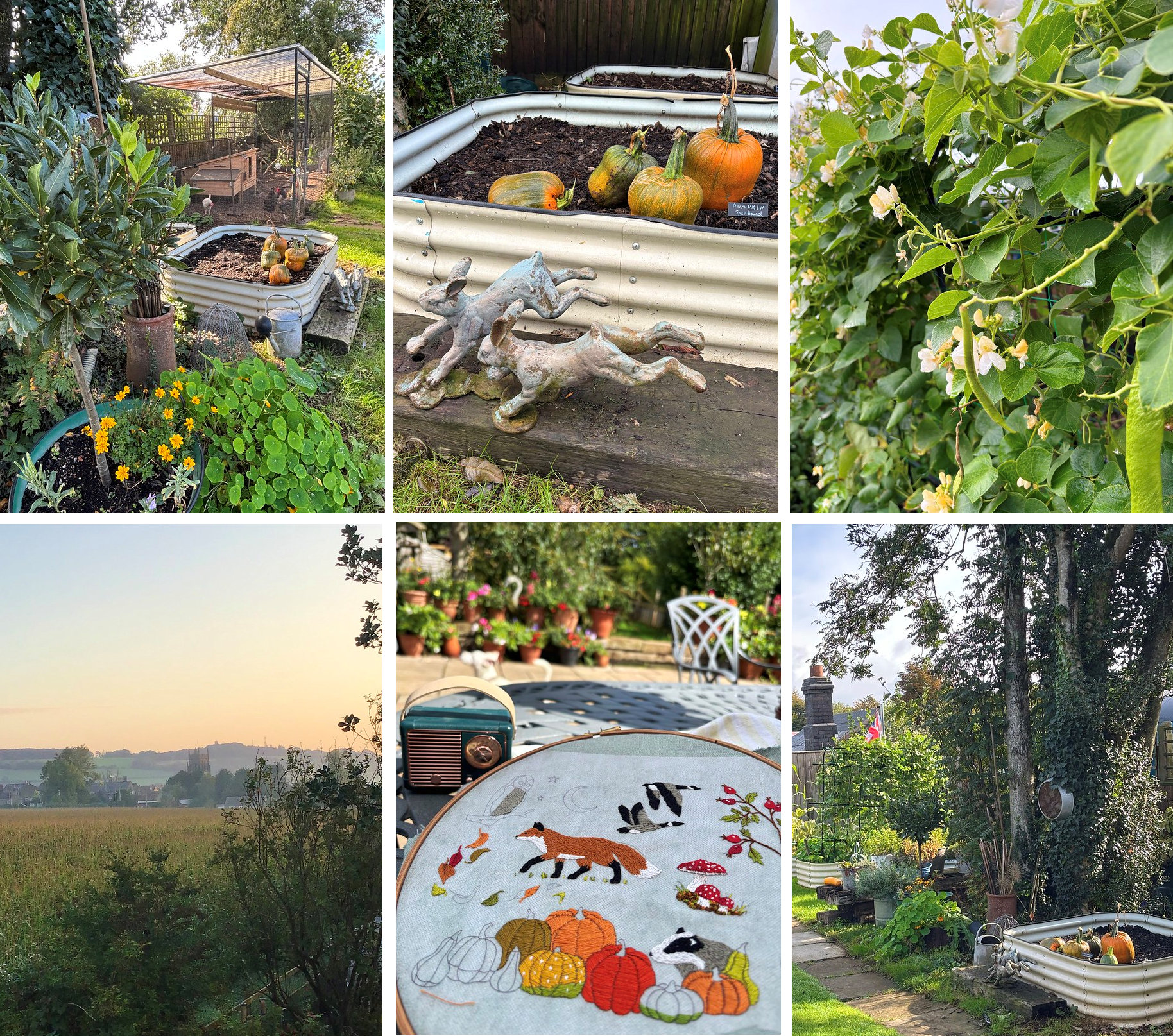 We returned home to a very autumnal garden and landscape. There were some cold nights while we were away and my squash and pumpkin plants had suffered badly. I spent yesterday clearing the beds and plan to make some lovely roasted squash soup in the very near future. The pumpkins are earmarked for my grandchildren Freddie and Florence at Halloween, though they are rather strange shapes! The embroidery in the centre is another wip for the October magazine.