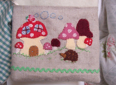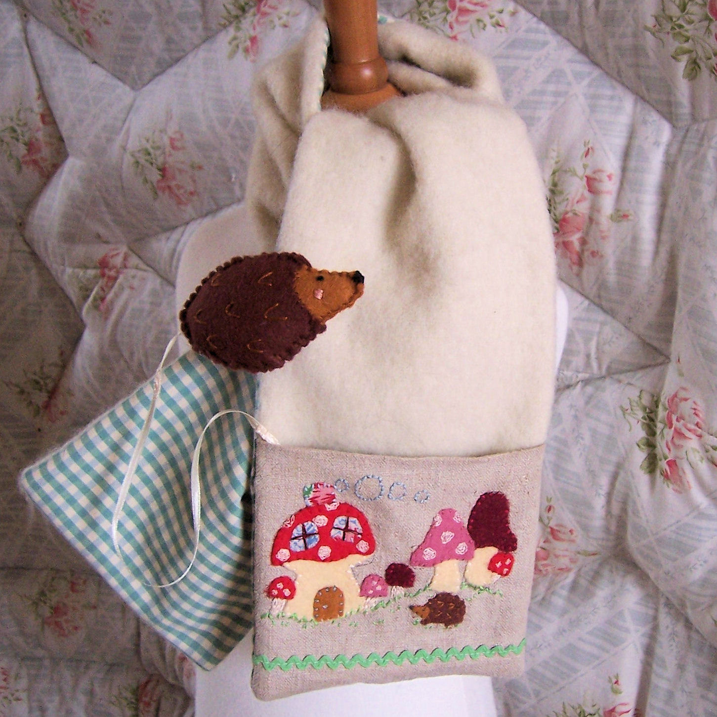 The pocket features a cute little hedgehog off on his way to visit his friend who lives in the red spotty toadstool. And his friend is attached to the base of the pocket with ribbon so he can’t fall out and get lost along the way. He tucks in very cosily and there’s room for one or two other treasures too!