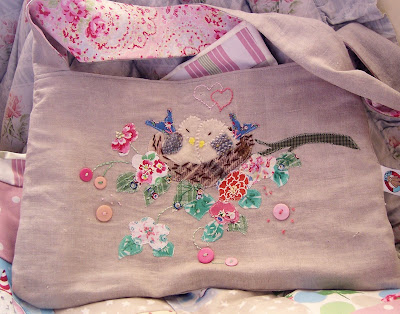 I’m rather pleased with how it turned out .. the birds’ bodies are vintage blanket scraps, as is the nest. The blossoms and leaves are a mixture of Cath Kidston and vintage scraps and I raided my button tin for the buds. In the end though I haven’t listed the bag as there’s a tiny hole in the linen where I’ve embroidered the two hearts, so I’m not quite sure what to do about it. Anyway, if you would like the pattern, just click on the black and white image above and you should get the large version ready to download.