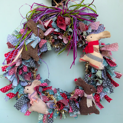 Bearing in mind Mencap’s making parties theme, I wanted to contribute a project that a group of people, whether adults or children, could enjoy making together. So I decided to donate a classic rag wreath tutorial – given the Bustle & Sew twist with the addition of some bunny decorations. These are also really easy to sew and make the rag wreath just a little bit special. And the raffia bow – that came from my wedding anniversary flowers from Townie Husband! (Ahhh).